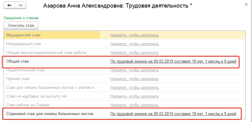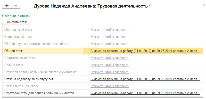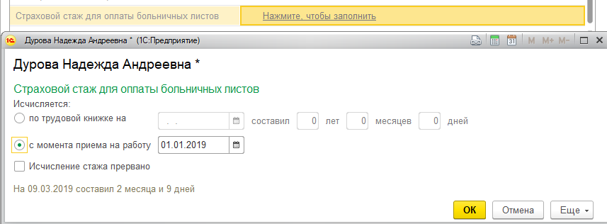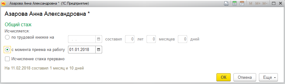 Обратите внимание, что здесь можно посмотреть стаж сотрудника на текущую дату. Запишем данные сотрудника.