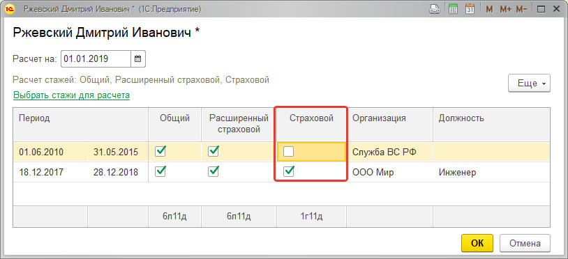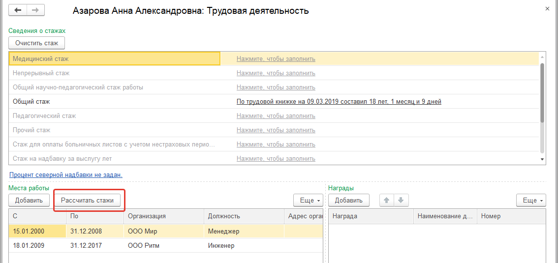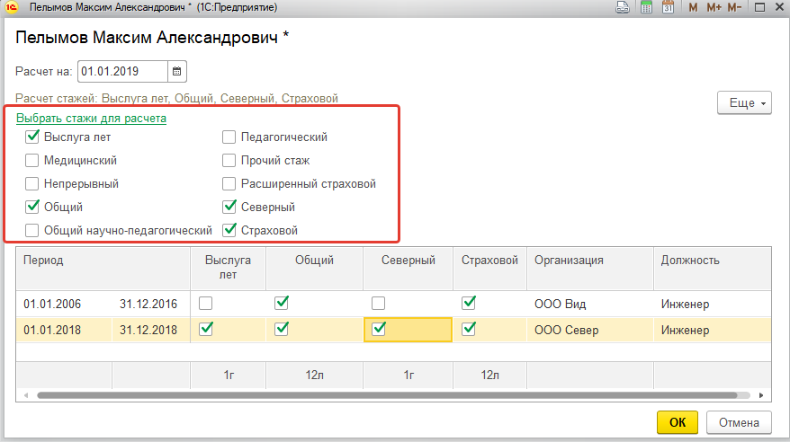 Рассчитаем стажи. Для него потребуется рассчитать следующие виды стажа: общий, страховой, северный и для надбавки за выслугу. Допустим, к северному и выслуженному стажу будет относиться только последнее место работы. Сохраним расчет по команде ОК.