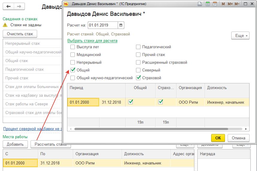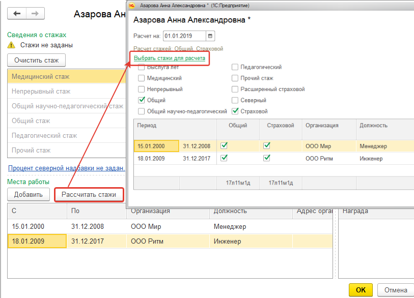 По команде "Рассчитать стажи" следует выбрать стажи – общий и страховой, и нажать ОК.