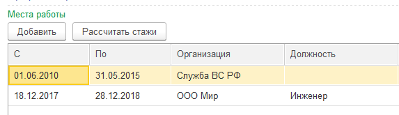 Заполним сведения о трудовой деятельность Пелымова М.А. (в рамках курса разрешается заполнять только периоды стажа).