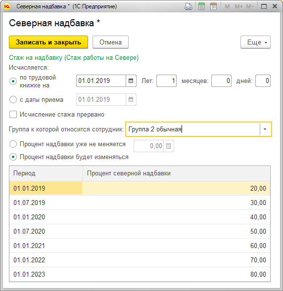 Сделаем это следующим образом: перейдем по ссылке "Процент северной надбавки не задан"; отметим, что процент надбавки будет изменяться - по группе 2 (обычная); получим заполнения будущих изменений стажа.