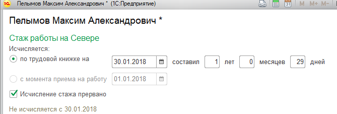 Возможны ситуации, когда отсчет определенного вида стажа сотрудника прерывается. Например, сотрудник устроился в организацию на севере, а затем на несколько месяцев переводится в подразделение, находящееся не в северном регионе. В этом случае северный стаж сотрудника не должен включать в себя время работы в таком подразделении.