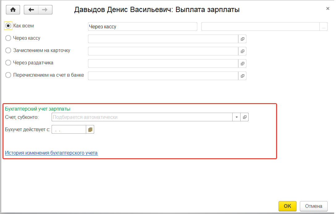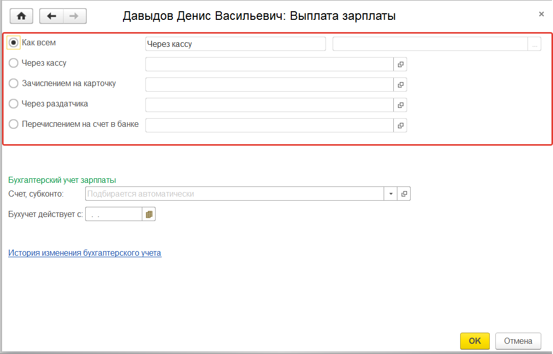 В разделе "Выплата зарплаты" указывается способ получения денежных средств сотрудником, если он отличается от способа в целом по организации или по подразделению.