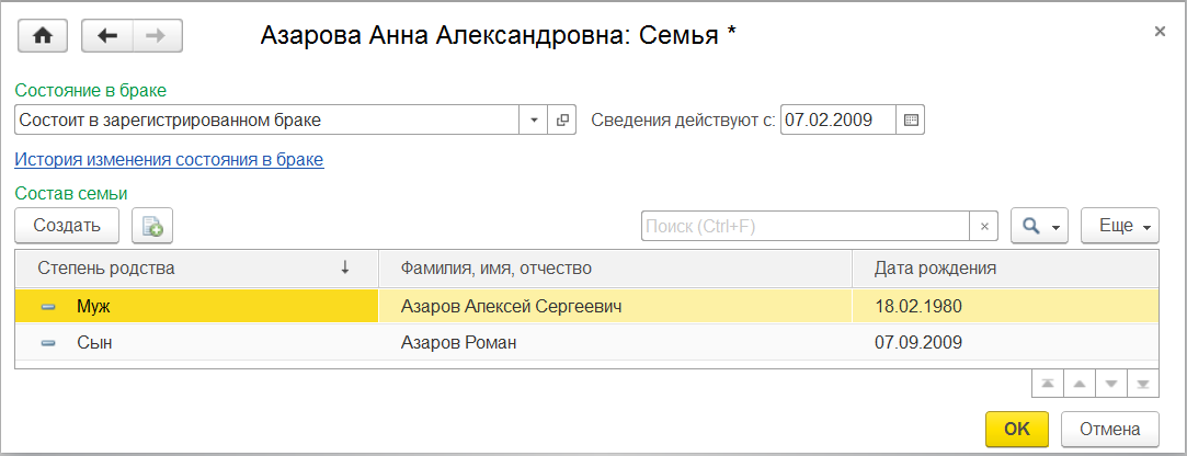 В карточке сотрудницы Азаровой А.А. перейдем по ссылке "Семья" и внесем сведения о состоянии в браке и родственниках.