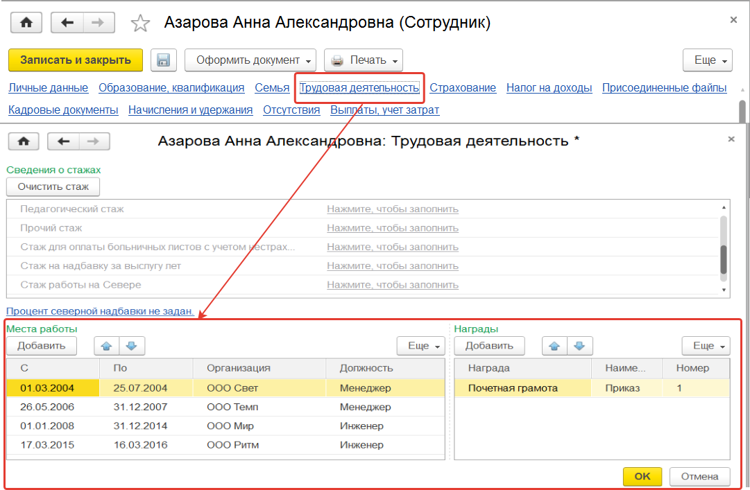 Трудовая деятельность". Раздел "Награды" заполняется сведения о полученных наградах и поощрениях.