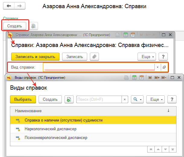 Это такие справки, как справка о наличии/отсутствии судимости, из различных диспансеров. Виды справок выбираются из одноименного справочника, пользователь может добавлять свои собственные виды предоставляемых справок.