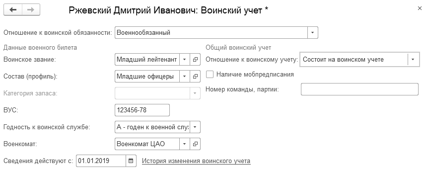 Данный раздел доступен, если в настройках кадрового учета программы установлен флаг "Ведется воинский учет". Эти сведения будут также использоваться в отчетности по воинскому учету. Сведения о воинском учете являются периодическими, т.е. могут изменяться во времени.