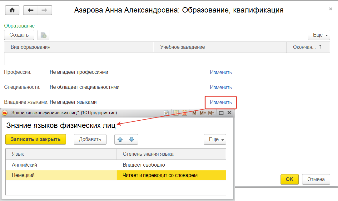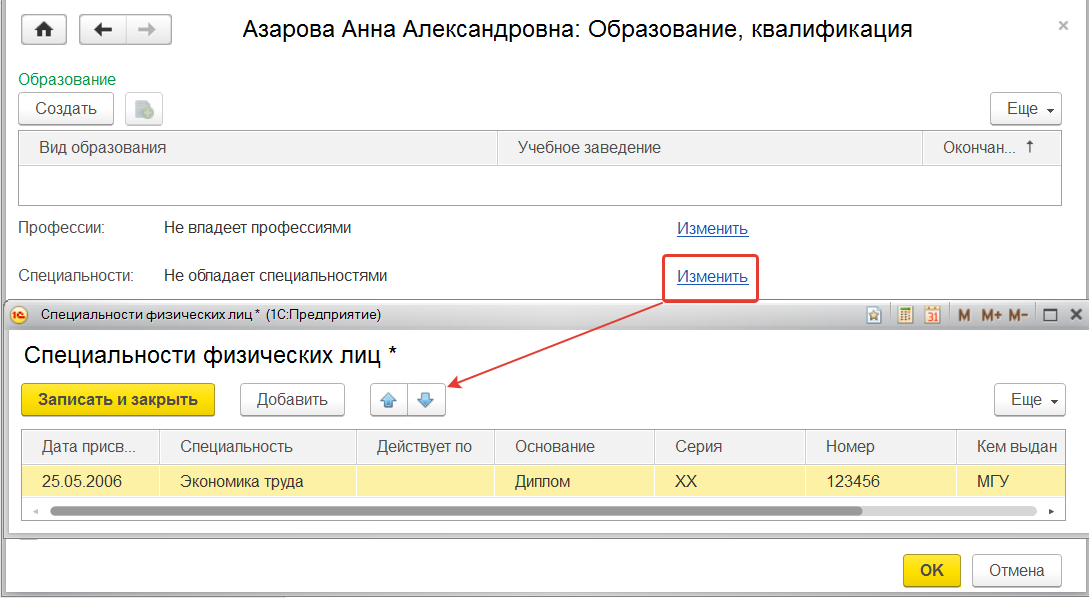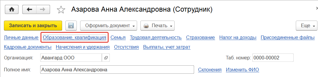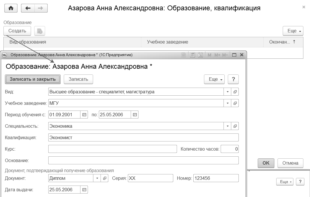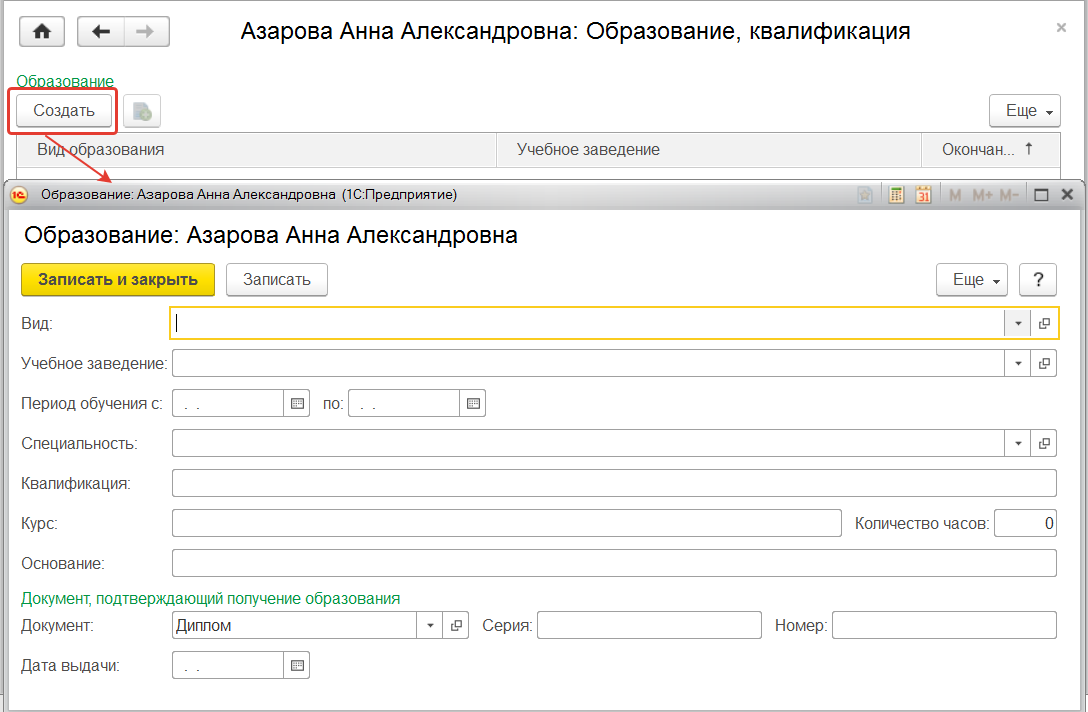 Внесем сведения об образовании для Азаровой А.А. Для этого в карточке данной сотрудницы перейдем по ссылке "Образование, квалификация" и нажмем команду "Создать". Заполним сведения о высшем образовании:- Вид образования – высшее (специалитет, магистратура)