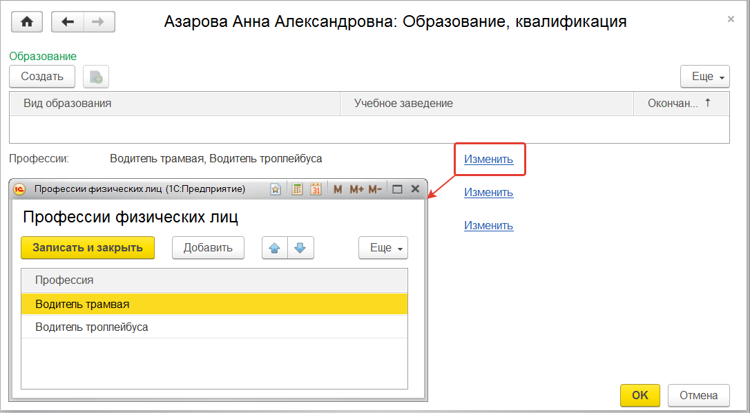 - Сведения о профессиях - обратите внимание, что для каждой профессии вносится отдельная строка;
