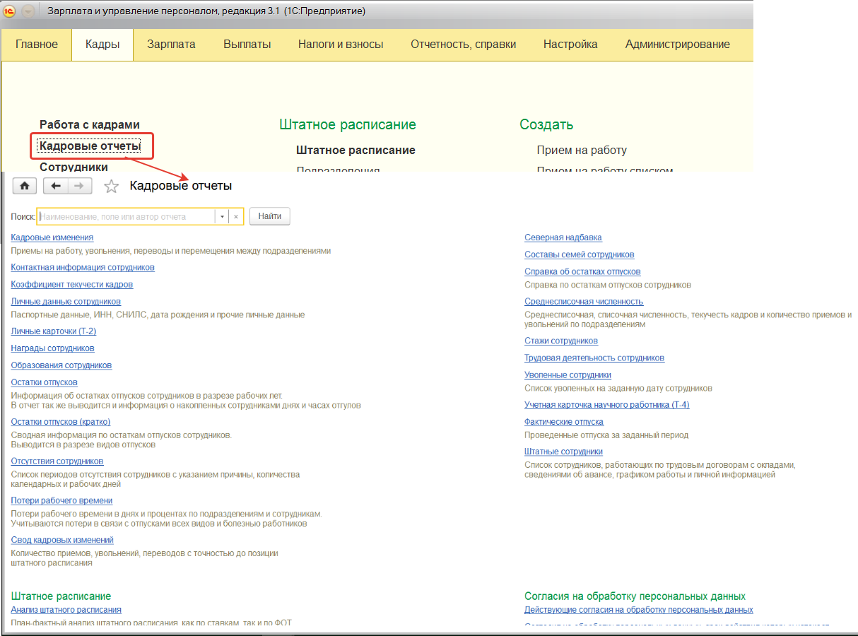 Для поиска ошибок в расчете зарплаты либо предоставления каких-либо сведений руководству или внешним получателям данных (статистика, ведомства и т.п.) используются отчеты по кадрам. Отчеты доступны в разделе "Кадры / Кадровые отчеты".