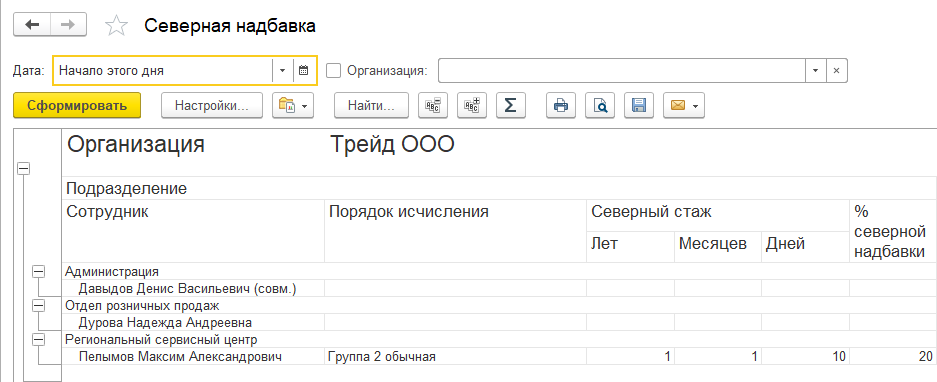 В отчете выводится список сотрудников и условия начисления северной надбавки за стаж, в том числе текущий северный стаж.