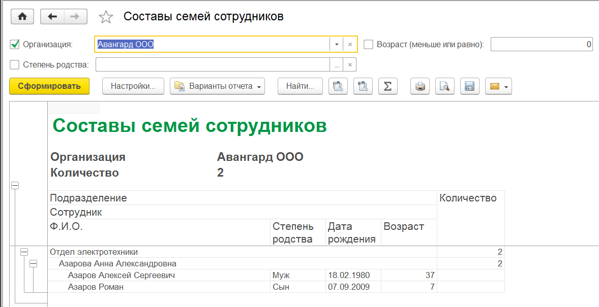В отчете выводится список сотрудников и сведения об их родственниках.