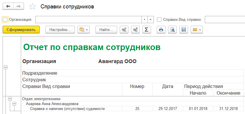 В отчете выводится список сотрудников и предоставленные ими справки о наличии/отсутствии судимости и пр.