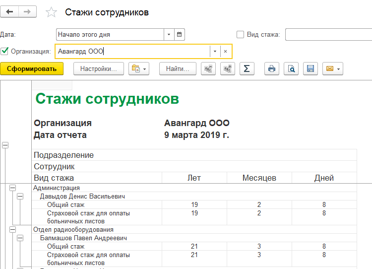 Отчет позволяет вывести перечень заполненных стажей по сотрудникам, и количество дней стажа на текущую дату.