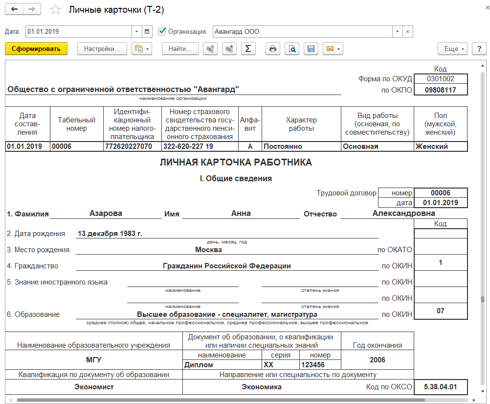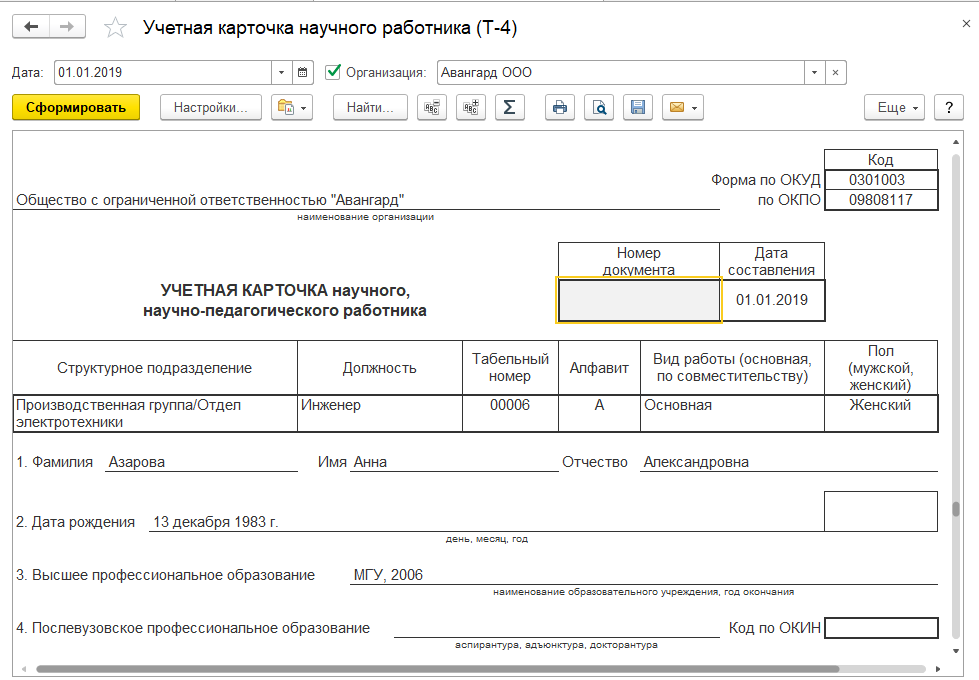 Выводится унифицированная форма карточки Т-4 с актуальными на дату отчета сведениями.