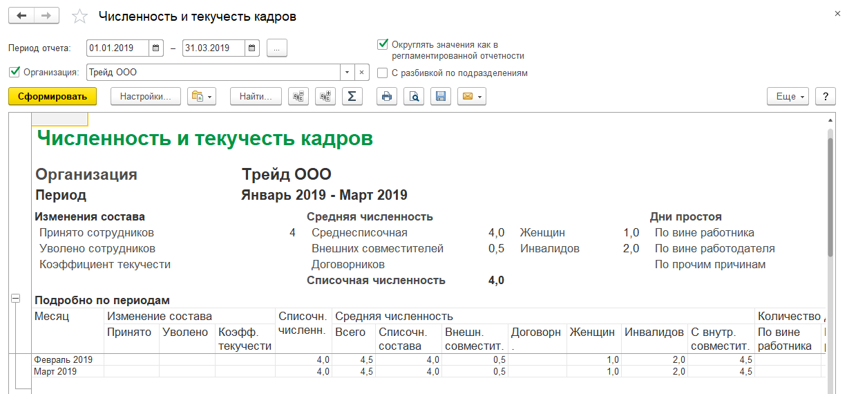 Отчет позволяет рассчитать списочную и среднесписочную численность за указанный период с учетом изменения состава, простоев, внешних совместителей и т.п.