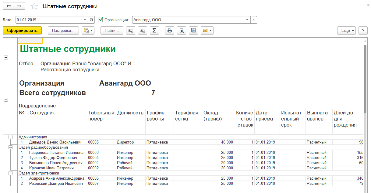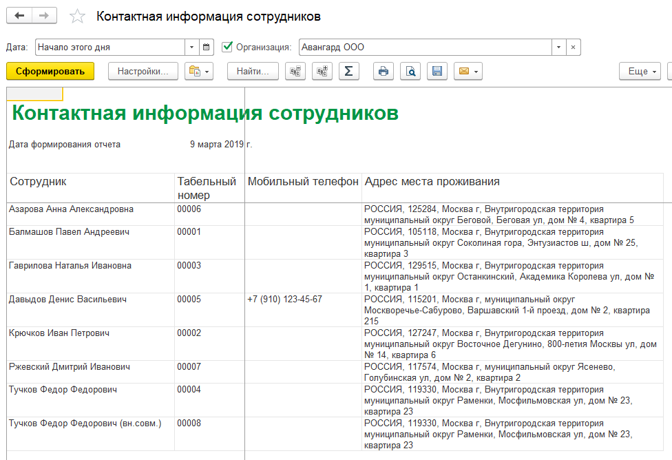 Отчет позволяет вывести список сотрудников с их контактами (своего рода адресная книга).