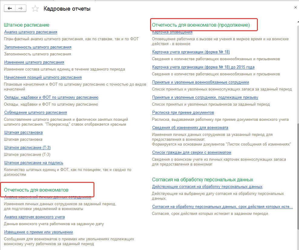 Также в разделе по кадровым отчетам можно найти блок отчетов по воинскому учету.