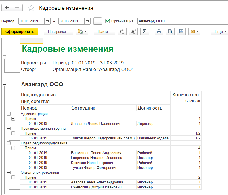 Отчет позволяет вывести пофамильный список принятых, уволенных и переведенных сотрудников за выбранный период