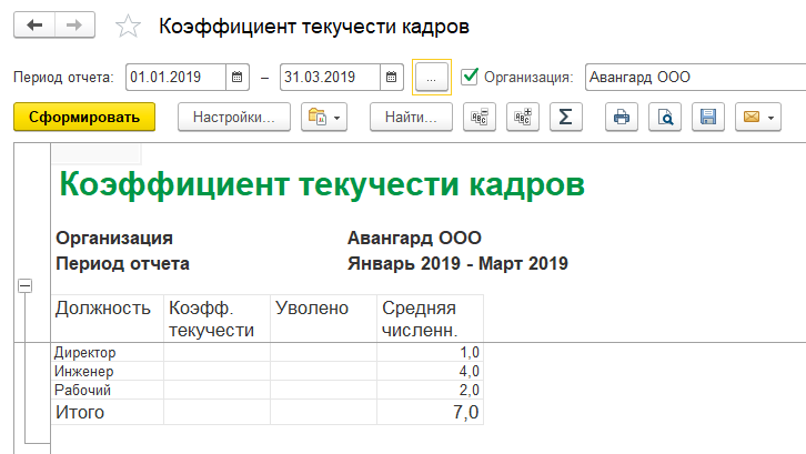 Отчет формируется за период и позволяет оценить коэффициент текучести кадров (отношение уволенных к средней численности за период).