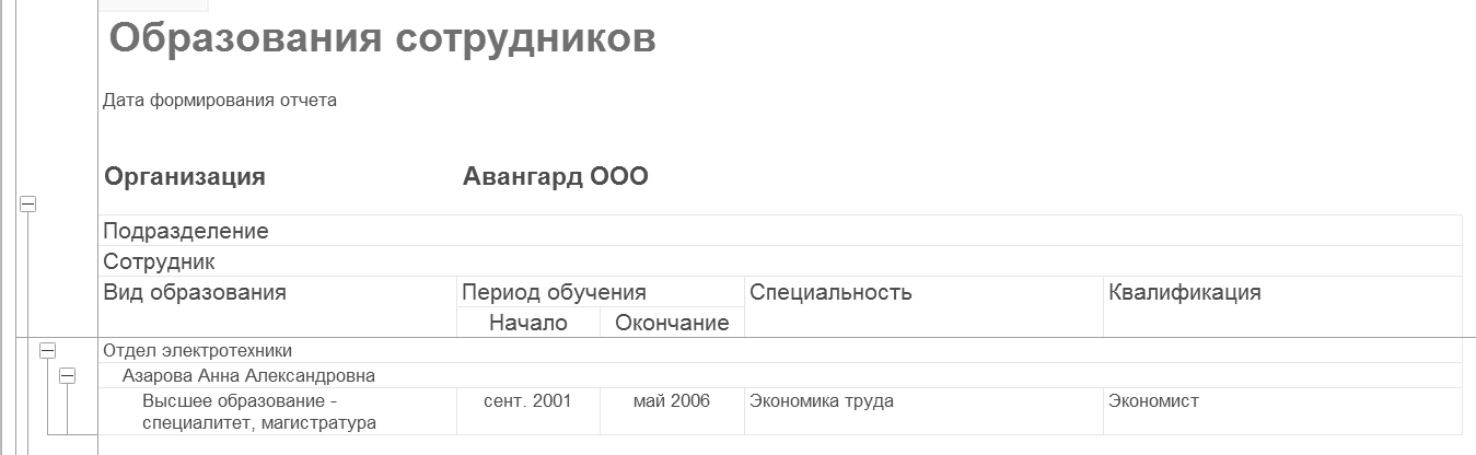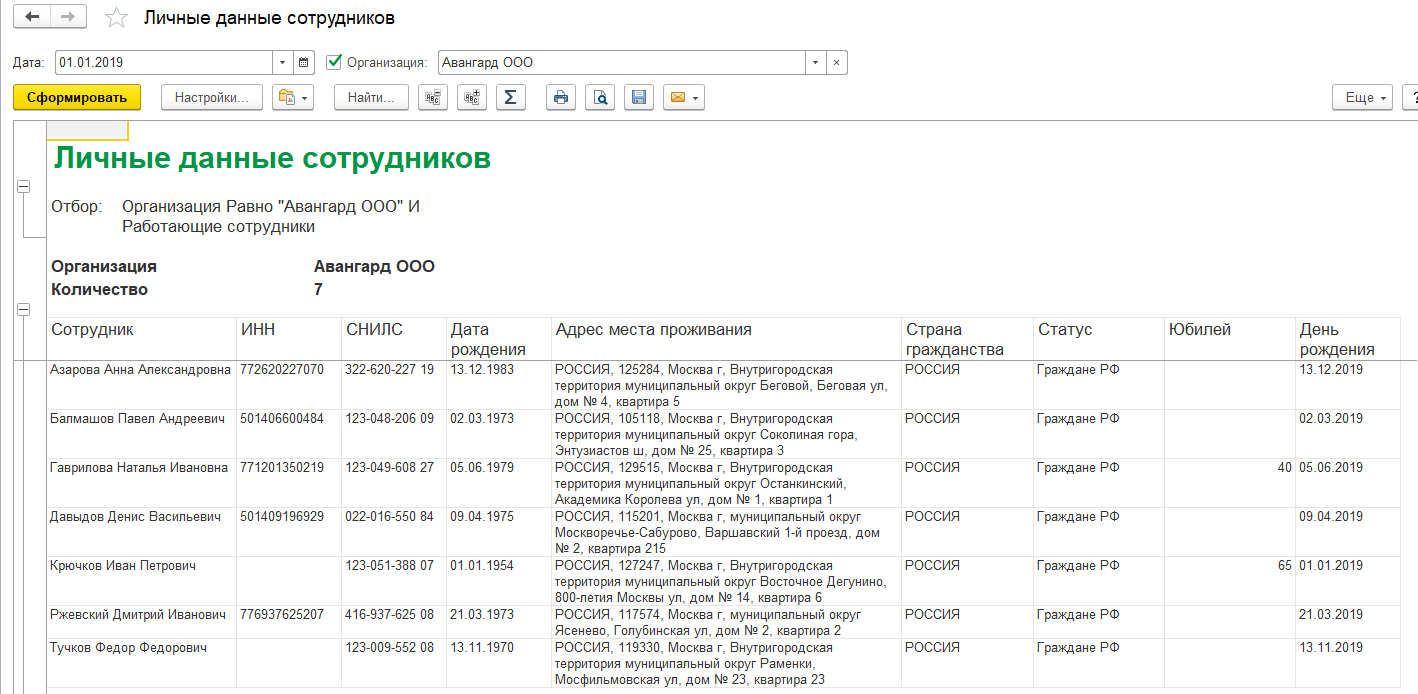 Отчет позволяет проверить полноту заполнения основных личных данных сотрудников.