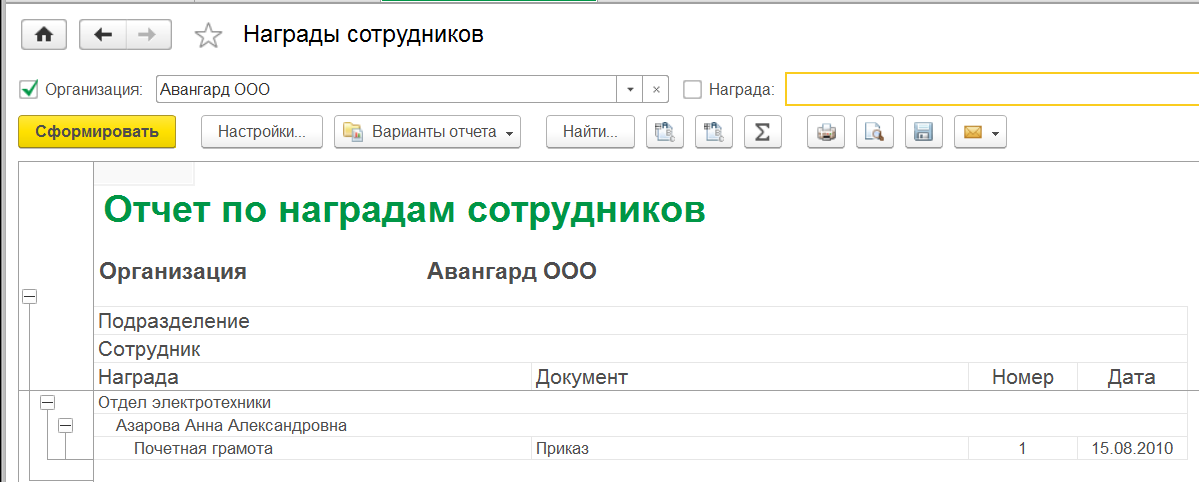 Выводится перечень наград, имеющихся у сотрудников организации.