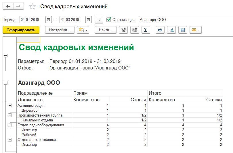 Отчет позволяет вывести общую информацию (без указания конкретных сотрудников) о приемах, переводах и увольнениях за заданный период в разрезе подразделений и должностей.