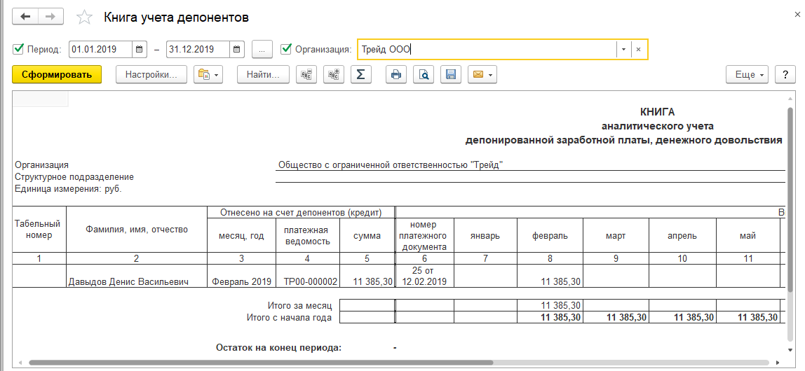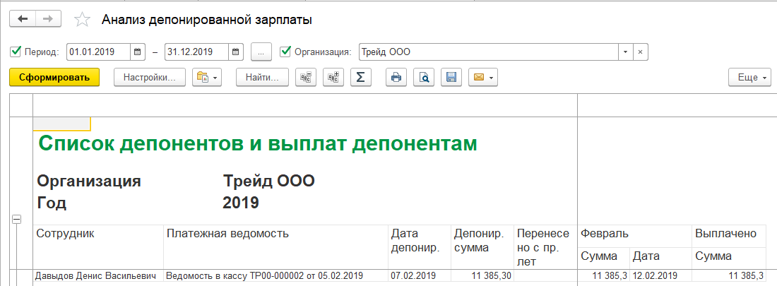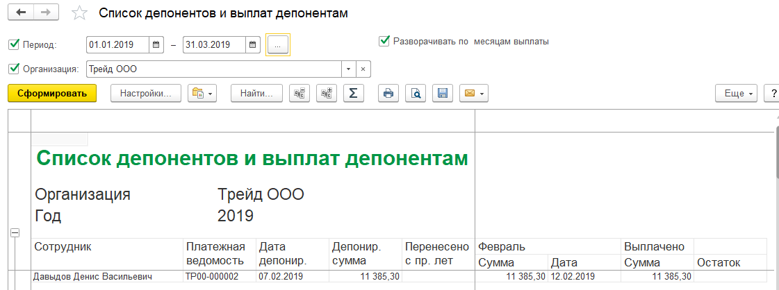 Список депонентов – позволяет оценить остаток депонированных сумм на конец периода в отчете по сотрудникам.