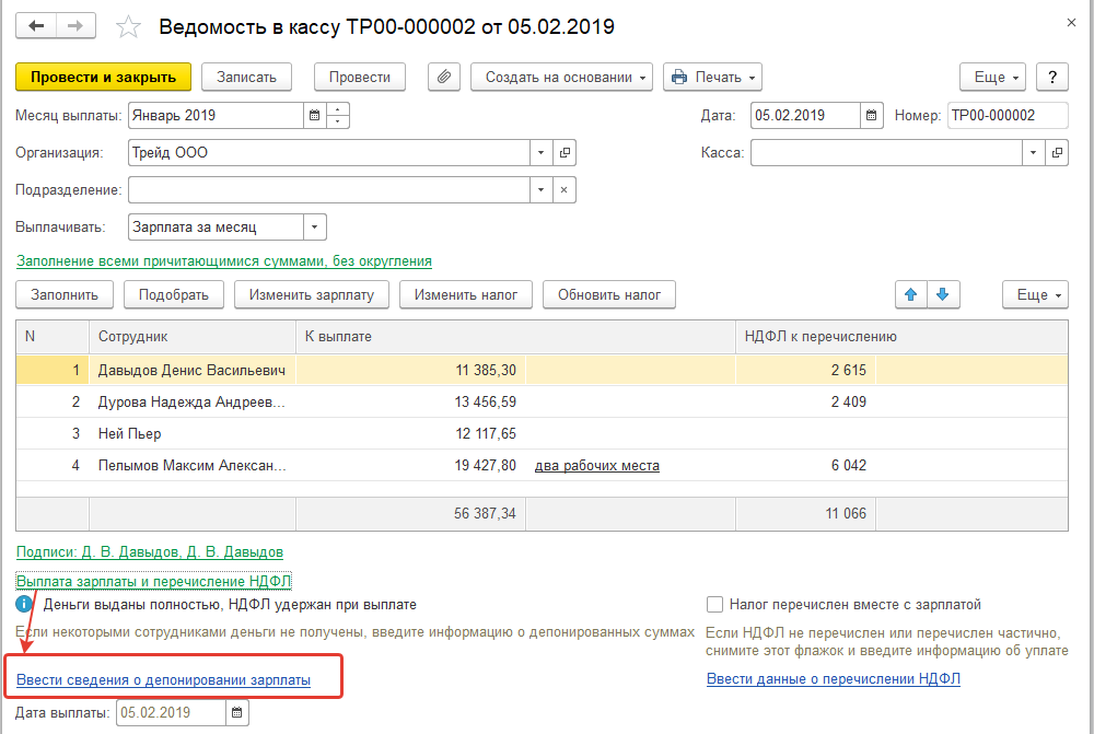 Создадим для ООО "Трейд" документ "Депонирование" на основании ведомости на выплату зарплаты через кассу для Давыдова Д.В. Для этого в разделе "Выплаты/ Все ведомости на выплату зарплаты" откроем ведомость в кассу на выплату январской зарплаты. Перейдем по ссылке "Выплата зарплаты, перечисление НДФЛ" и создадим документ "Депонирование" по ссылке "Ввести сведения о депонированной зарплате".