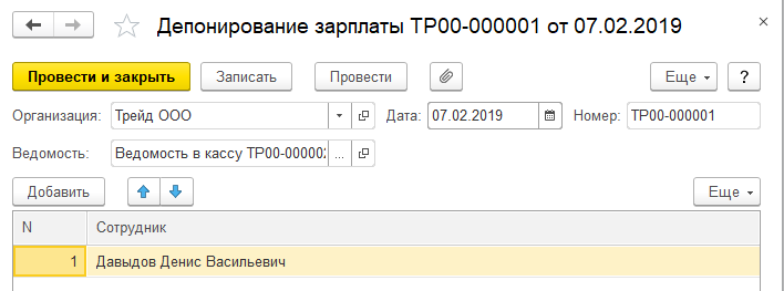 Укажем дату документа – 07.02.2019, сотрудника Давыдова Д.В. добавим вручную.