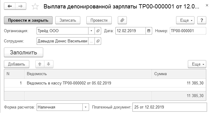 Если сотрудник впоследствии пришел получать депонированную зарплату, то создается документ "Выплата депонированной зарплаты". Документ доступен из раздела "Выплаты / Депоненты". В документе указывается организация и сотрудник, который получает депонированную зарплату. По команде "Заполнить" можно заполнить документ всеми задепонированными суммами этому сотруднику по всем ведомостям. Ниже указывается форма расчетов и реквизиты платежного документа.