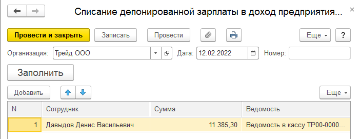 Если сотрудник не получил депонированную зарплату, то через некоторое время (в текущей версии программы для автоматического заполнения – через 3 года) суммы депонированной зарплаты могут быть списаны в доходы организации. Для этих целей создается документ "Списание депонированной зарплаты в доходы предприятия", который по команде "Заполнить" заполняется подобной просроченной задолженностью (документ может быть заполнен и вручную). Документ также доступен в разделе "Выплаты / Депоненты".