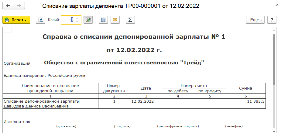 Проведем документ. Выведем на печать реестр депонированных сумм.