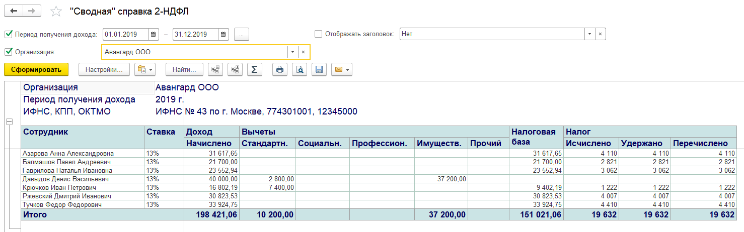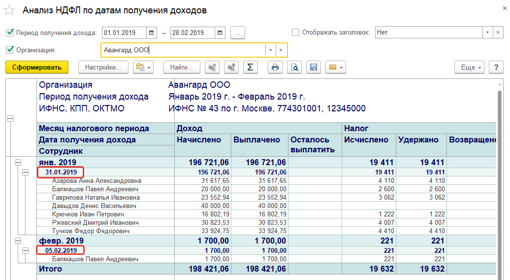 Сформируем отчет с 01.01. по 06.02.2019 по организации ООО "Авангард" с разбивкой по сотрудникам.
