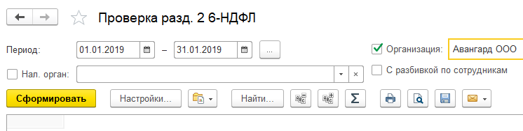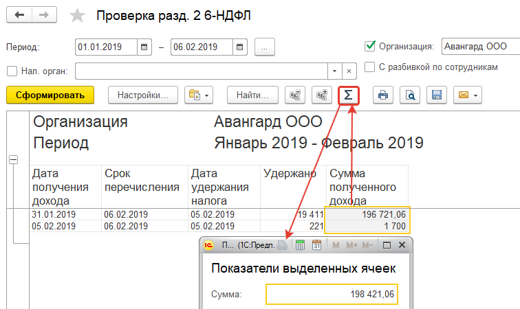 2) Сформируем отчет с 01.01.2019 по 06.02.2019 по организации ООО "Авангард", убедимся, что доходы и налог удержанный в полном объеме отражен во составе второго раздела отчетности 6-НДФЛ.
