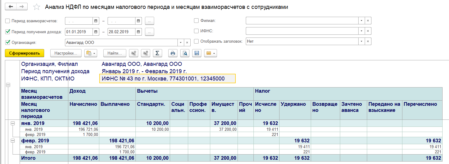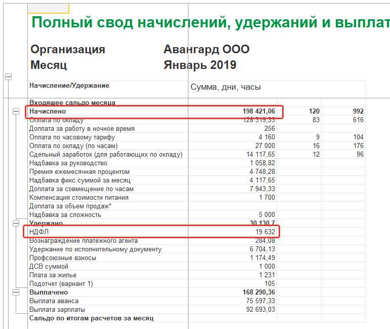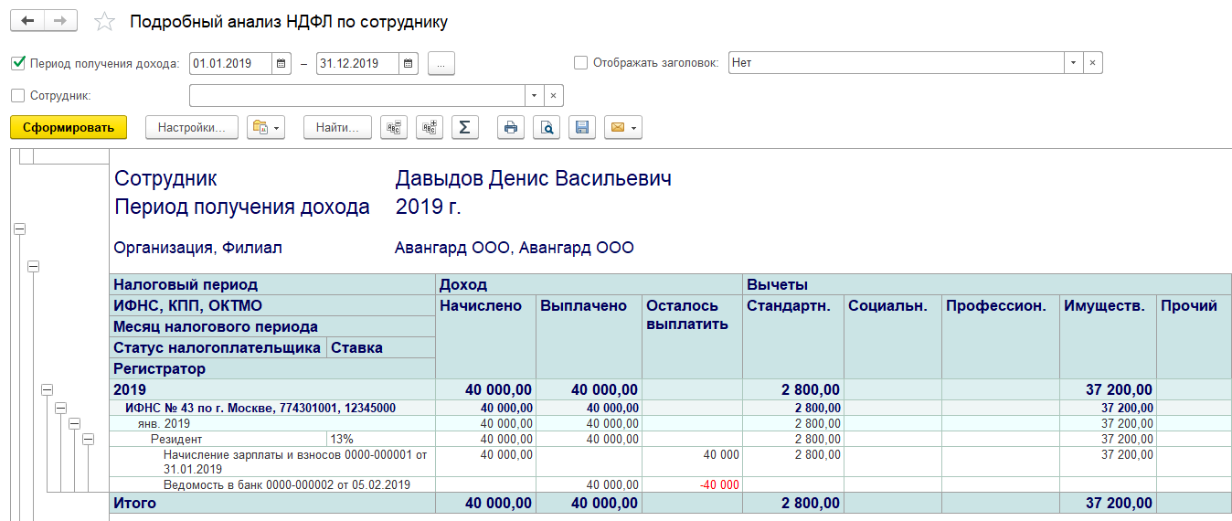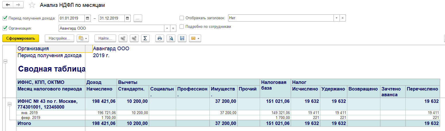 Сформировав отчет, мы получим бухгалтерские данные с особенностями учета НДФЛ.