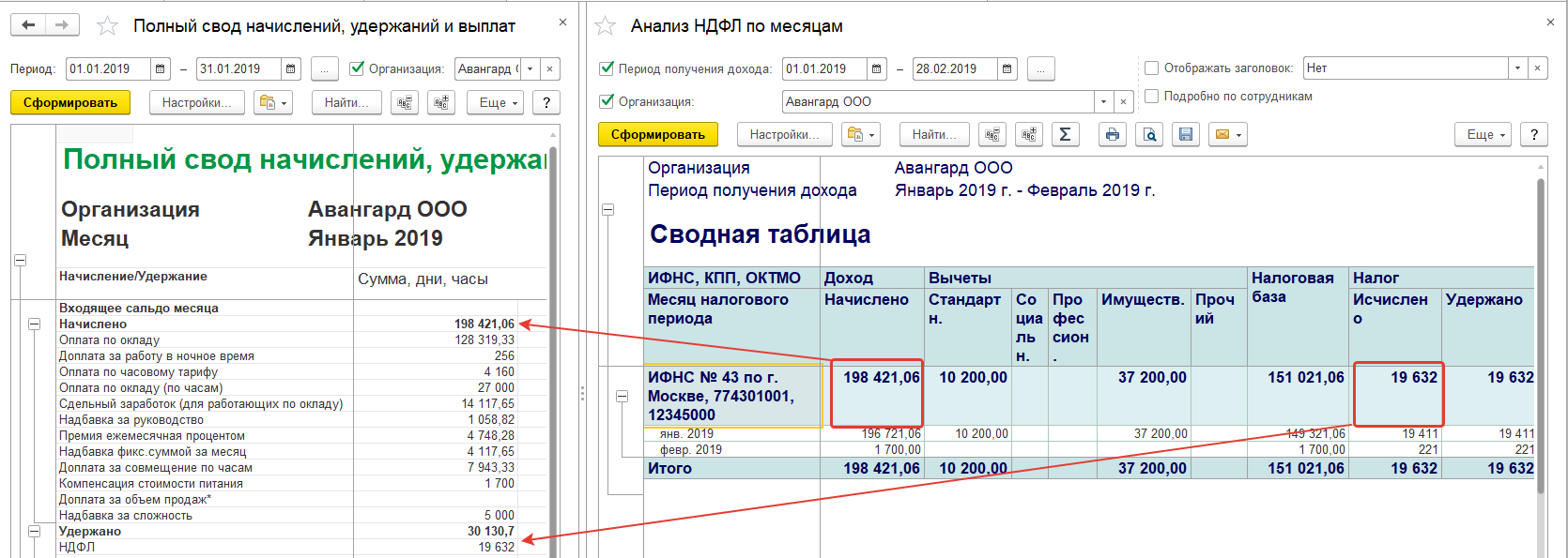 Для ежемесячного контроля сумм НДФЛ можно использовать как информацию по документам, так и аналитические отчеты.