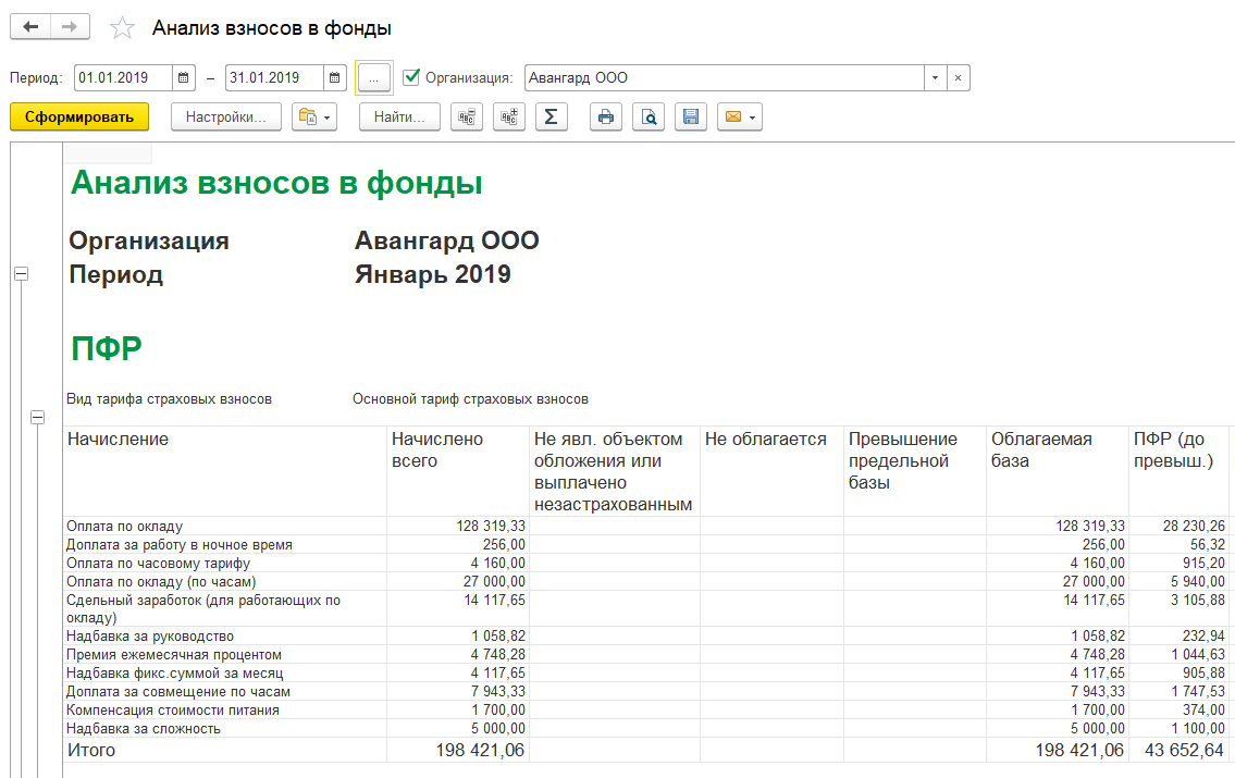 Данный отчет позволяет проанализировать включение доходов в базу по взносам, применение различных тарифов взносов, и исчисленные суммы по взносам. Отчет показывает информацию по каждому фонду в отдельности.