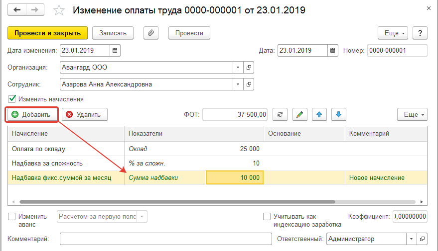 1. С 23.01.19 сотруднице ООО "Авангард" Азаровой А.А. назначена персональная надбавка фиксированной суммой за месяц – 10 000 руб. Откроем раздел "Зарплата / Изменения оплаты труда" и добавим документ "Изменение оплаты труда" на 23.01.2019. Добавим новое начисление.