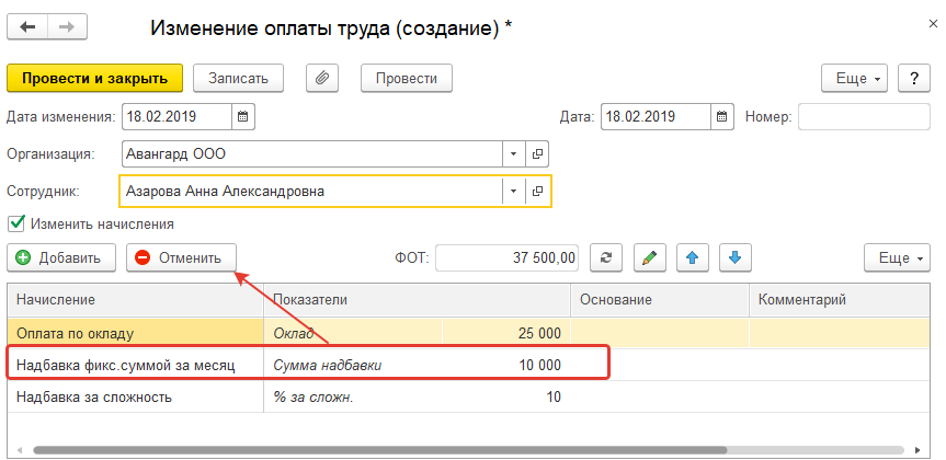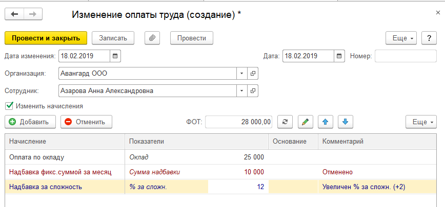 2. С 18.02.2019 сотруднице ООО "Авангард" Азаровой А.А. доплата за личные деловые качества отменена, но при этом повышен процент надбавки за сложность работы. Зарегистрируем документ "Изменение оплаты труда" на новую дату. Доплату за деловые качества следует отменить по соответствующей команде.