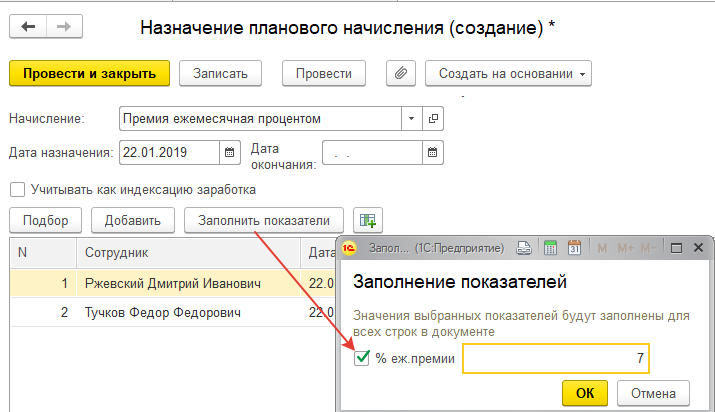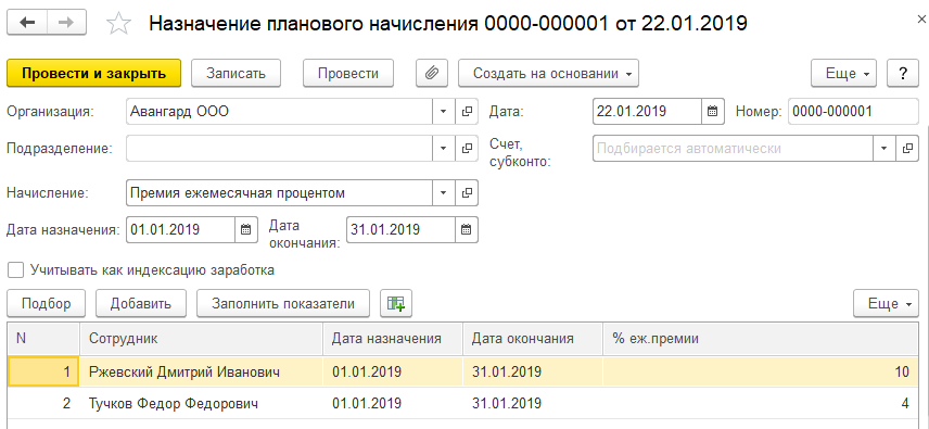 2. С 22.01.2019 сотрудники ООО "Авангард" Ржевский Д.И. и Тучков Ф.Ф. получили дополнительные задания руководства, за которые на период их выполнения им также назначена премия ежемесячная процентом. Зарегистрируем документ "Назначение планового начисления" на новую дату и укажем процент надбавки 7% и периоды выполнения заданий: