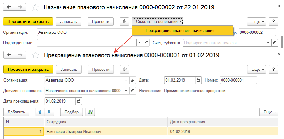 С 01.02.19 сотруднику ООО "Авангард" Ржевскому Д.И. прекращена надбавка за ОВЗ за второе задание (назначенная в размере 7%). Откроем раздел "Зарплата / Изменения оплаты труда" и добавим документ "Прекращение планового начисления" на 01.02.2019 (можно использовать ввод на основании). Выберем соответствующий документ из списка документов-назначений. Либо можно воспользоваться вводом на основании документа, назначившего премию.
