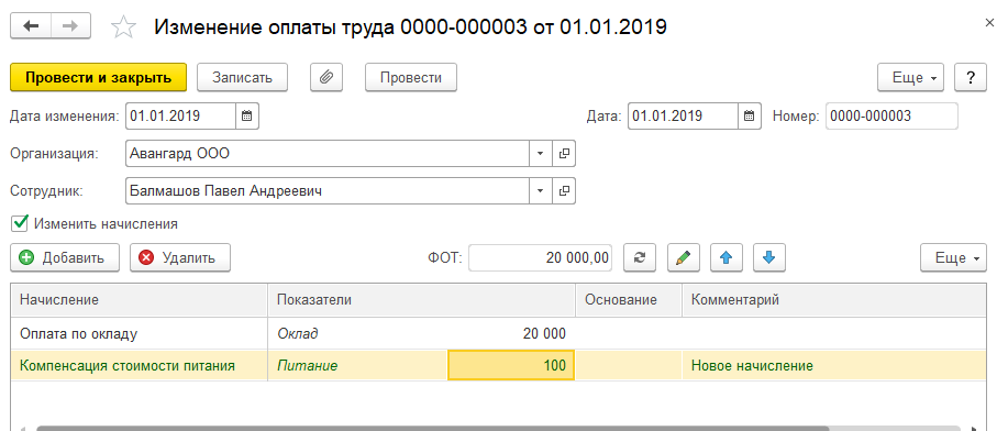 1. Сотруднику ООО "Авангард" Балмашову П.А. с 01.01.19 назначена компенсация стоимости питания в размере 100 руб. в день. Следует выбрать документ и заполнить, которым можно назначить данное постоянное начисление сотруднику. Один из вариантов представлен на рисунке ниже.