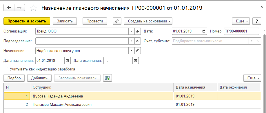 2. Сотрудникам ООО "Трейд" Пелымову М.А. и Дуровой Н.А. с 01.01.19 назначена постоянная надбавка за выслугу лет. Следует выбрать и заполнить документ, которым можно назначить данное постоянное начисление сотрудникам. Один из вариантов представлен на рисунке ниже.