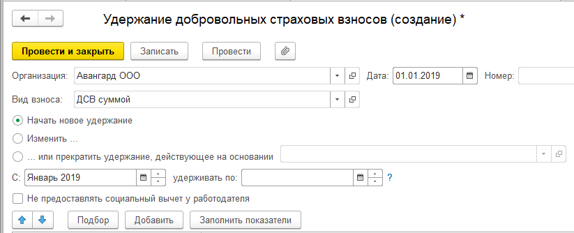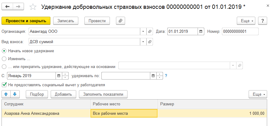 Введем удержание добровольных страховых взносов в размере 1000р. у сотрудницы ООО "Авангард" Азаровой А.А. с 01.01.19 (вид удержания - Добровольные страховые взносы (суммой)). Для этого из раздела "Зарплата / Алименты и другие удержания" создадим документ "Удержание добровольных страховых взносов" и заполним его как на рисунке ниже. Обратите внимание, что принято решение не предоставлять социальный вычет.