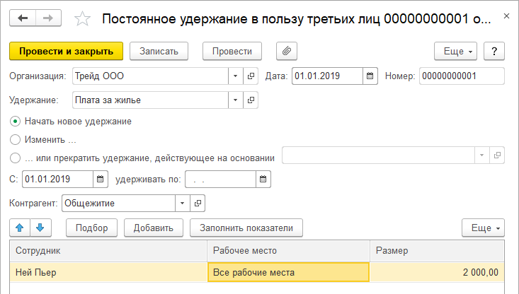 Сумма оплаты постоянная и составляет 2000 руб. в мес., контрагент – Общежитие (контрагента следует добавить в одноименный справочник). Введем данное удержание в программу как постоянное, т.е. без указания даты окончания действия удержания.