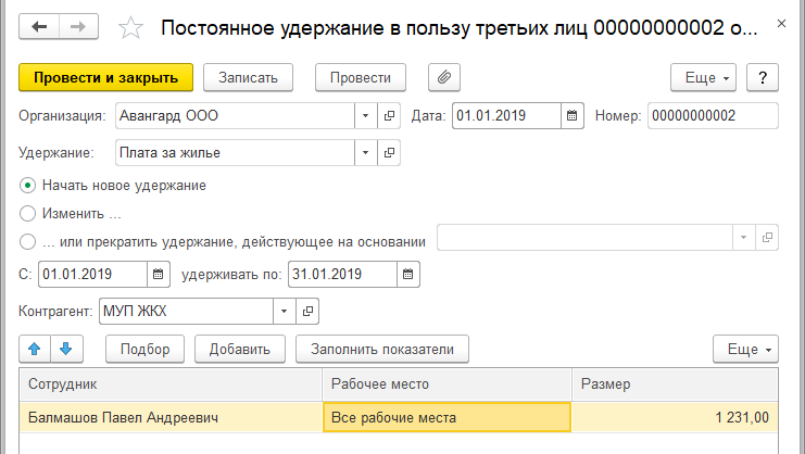 Для того чтобы изменить или отменить постоянное удержание, следует ввести новый документ и указать соответствующее действие с новой даты. Если удержание по факту разовое, то в документе указывается дата начала и дата окончания удержания в пределах месяца.