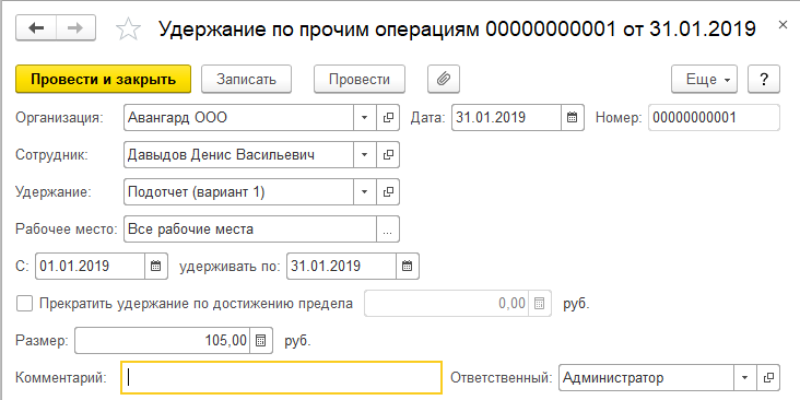 Из заработка сотрудника ООО "Авангард" Давыдова Д.В. производится удержание невозвращенной подотчетной суммы за январь 2019г. в размере 105 руб. Введем удержание в счет расчетов по прочим операциям.