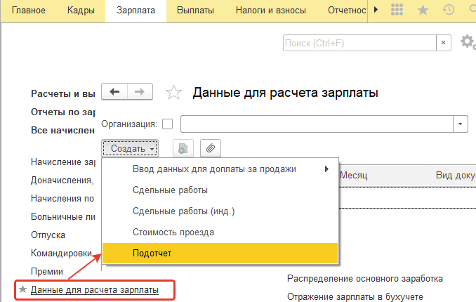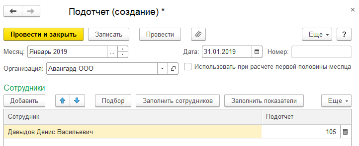 · заполняем сотруднику разовую сумму показателя "Подотчет" – результат также, как и при первом варианте, в итоге отразится в документе "Начисление зарплаты и взносов".