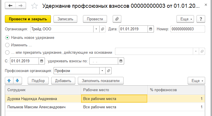 1. Профсоюзные взносы удерживаются у Дуровой Н.А. и Пелымова М.А. в размере 1% с января 2019г.